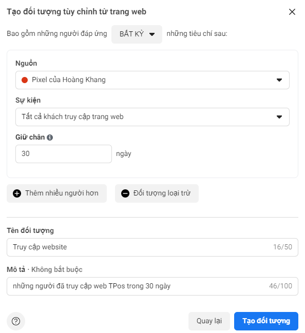 Website Custom Audiences – Đối tượng tùy chỉnh trên website